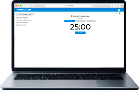 Atualmente, estou desenvolvendo uma aplicação web de pomodoro usando React no front-end e Node.js com Express e MongoDB (Mongoose) no banco de dados. Os usuários podem criar um perfil e estabelecer objetivos que serão usados no sistema de pomodoro, registrando o tempo dedicado a cada objetivo.